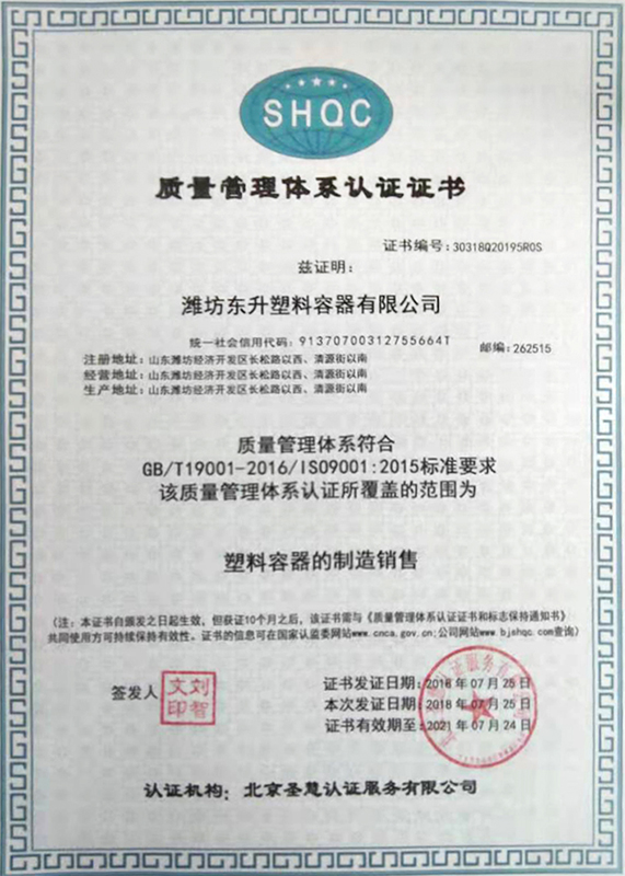 東升容器通過了ISO9001質量管理體系認證,產品質檢貫穿產供銷,品質有保障