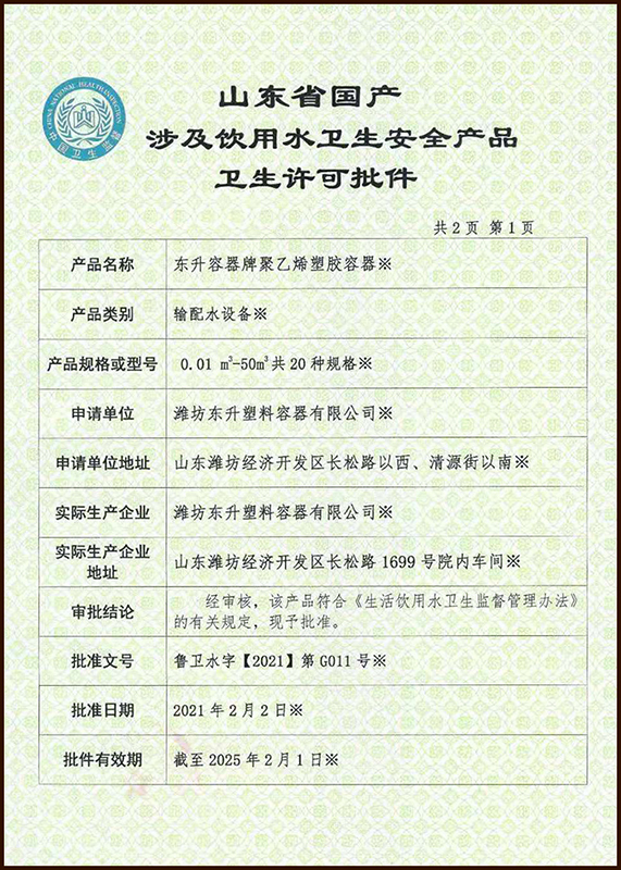 • 山東省衛生許可證批件-東升容器